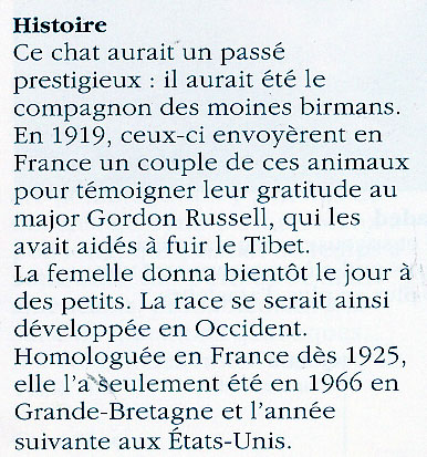 Nulle origine n'est plus controversée que celle du Sacré de Birmanie. La légende mille fois transformée aborde avec féérie l'histoire de ce magnifique chat. Mais son histoire est toute autre. LA LEGENDE Il y’a des siècles et des siècles, dans les hautes